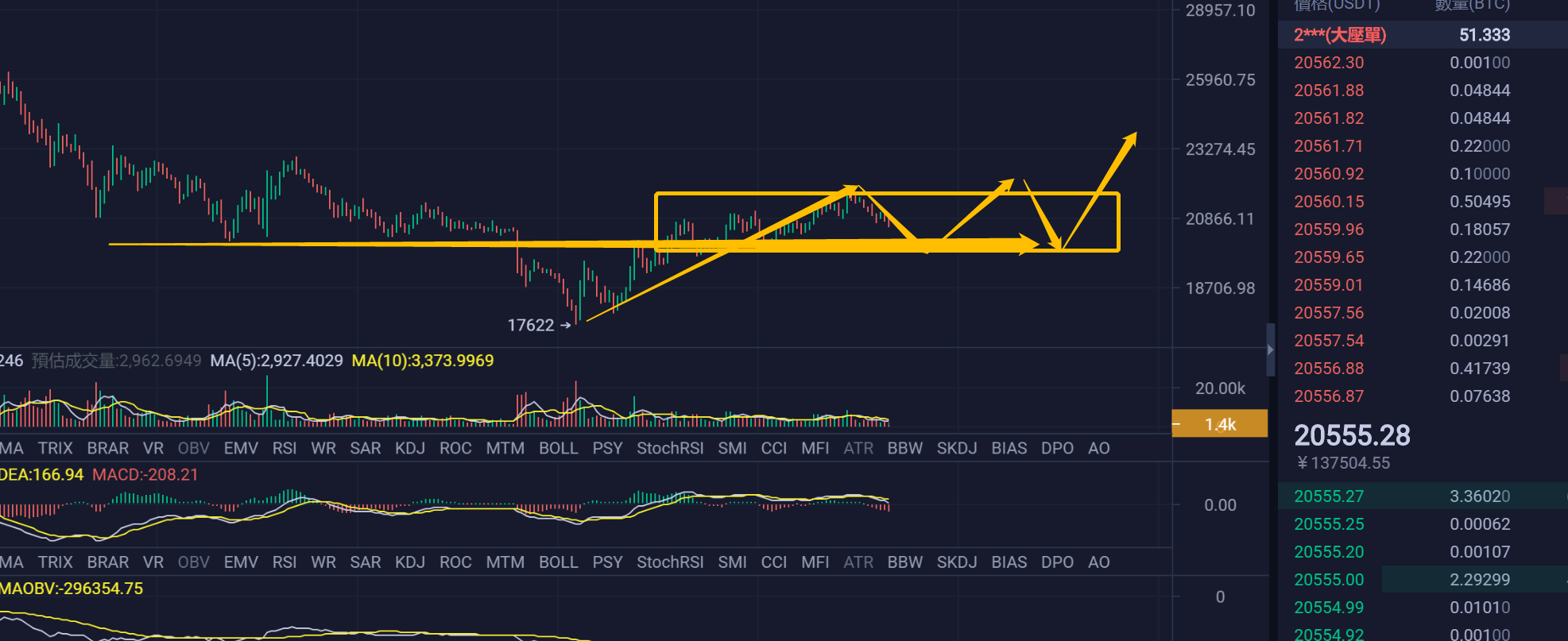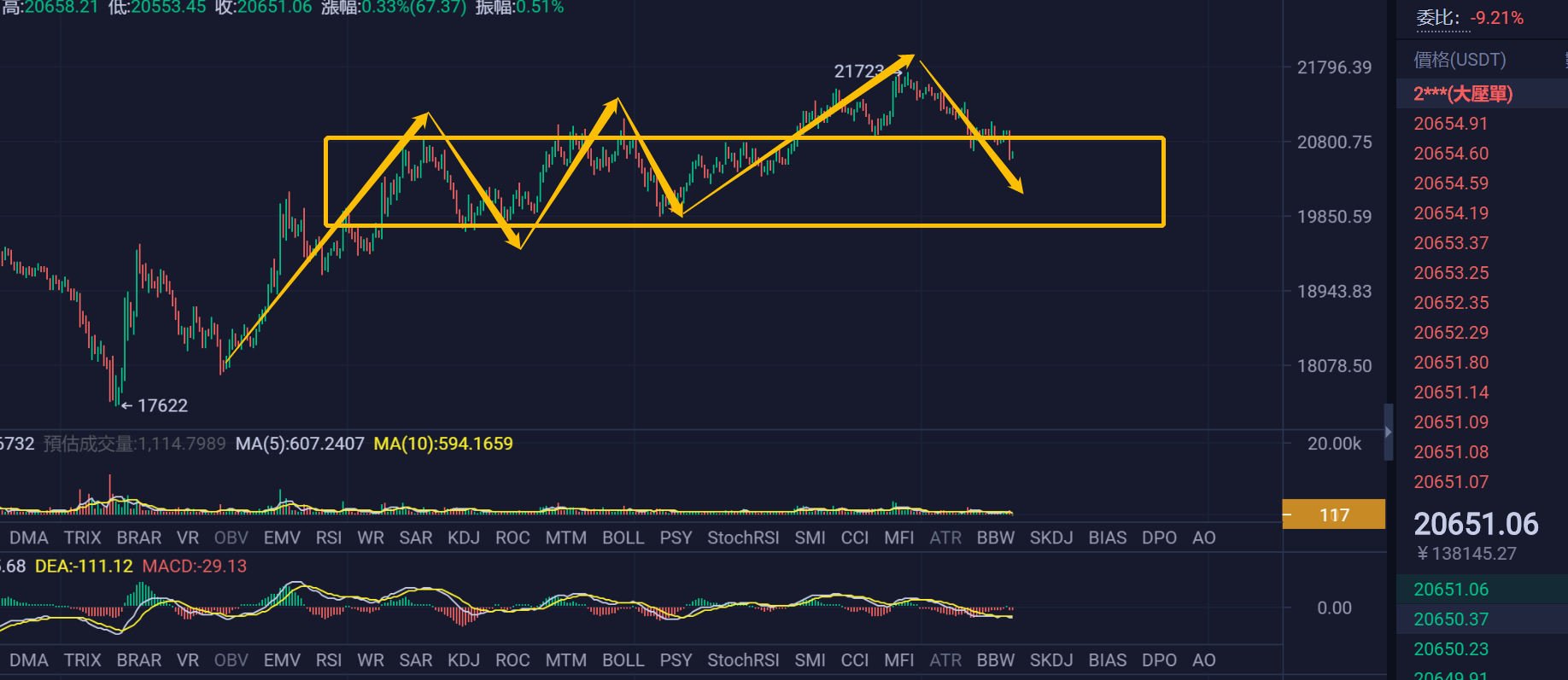 大饼1H的结构,目前大饼正在回调一笔1H的下跌,但是个人认为大概率会在1.95W-2.1W这个区间做一个1H的中枢震荡的走势,也就是如图的走势,然后再突破2.1W在走一个4H的笔的上升的延伸笔的走势,或者在跌回去继续保持震荡为主的走势,但是大概率不会跌破17622的前低点,整体的结构可能会保持一个中枢区间之内的震荡走势,也就是反复。有利润该跑就跑。