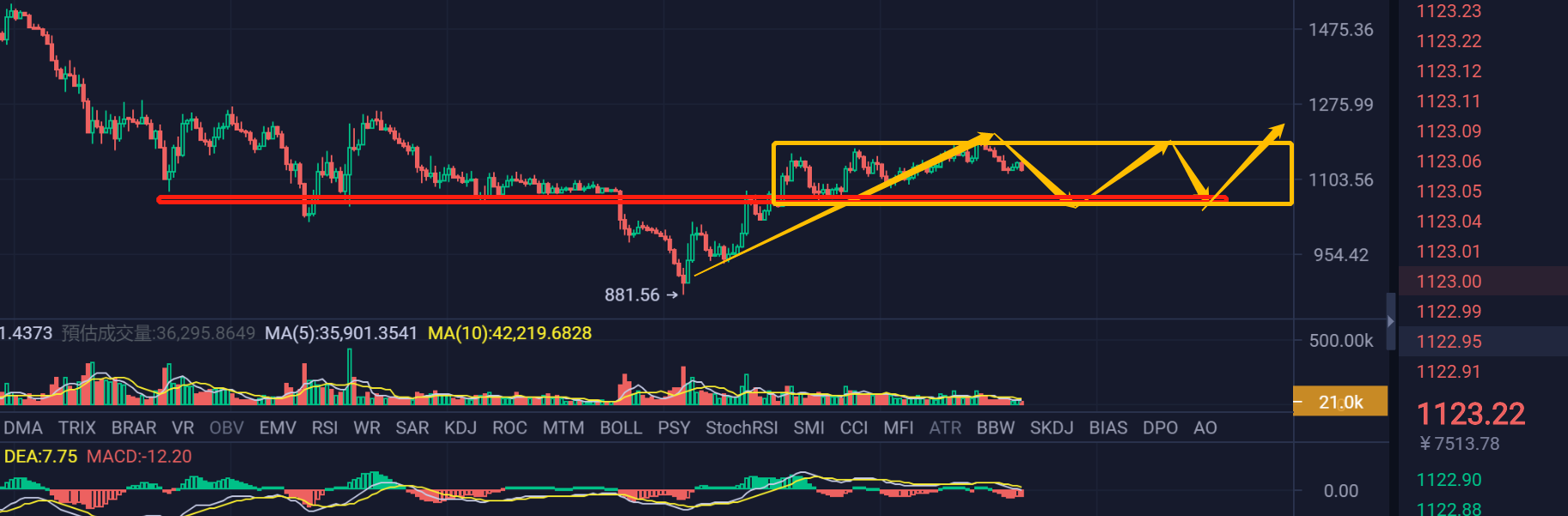 姨太1H的结构,姨太的整体走势要比大饼的走势稍微弱上许多,结构走势没有大饼的清晰而且强劲,但是结构的话只要不跌破红色线区域的话还是处于一个构建一个1H的中枢的走势,然后再寻找方向选择突破。
