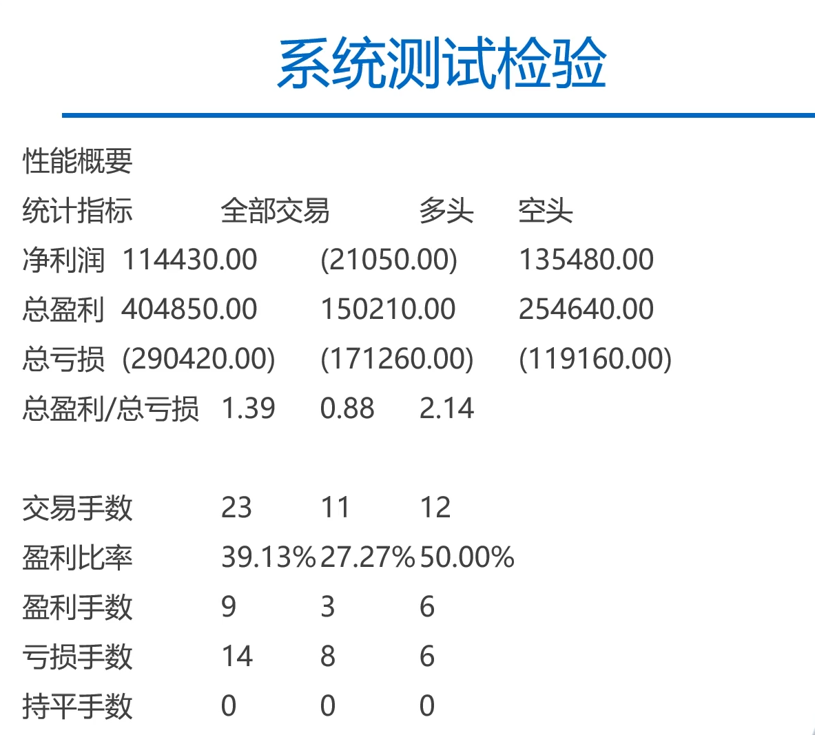 实际上就是要把我们做的交易的一些性能、统计指标列出来,比方说分为全部交易有多少手,然后多头是多少,空头是多少,我们总的利润,比方说我们总盈利多少,总的亏损是多少,总盈利除以总亏损的盈亏比是多少?大家可以看看这回是1.39,总的盈利除以总亏损。