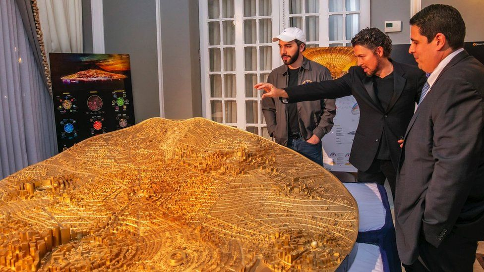 总统Bukele在推特上发布了“比特币城”的比例模型,宣布他们将会在火山脚下建造这座城市,用火山地热能源为巨大的比特币矿场供电。