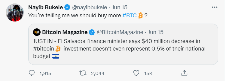 萨尔瓦多总统,是坚定的“逢低买入”支持者,三番五次地在推特上说: