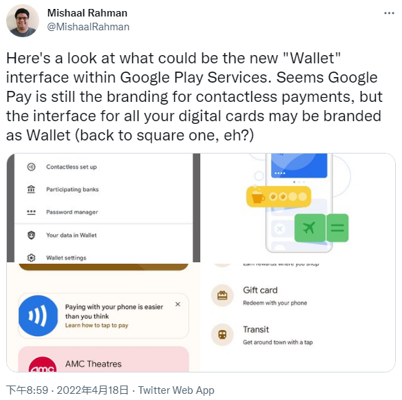 Android Police 援引 Mishaal Rahman 的 Twitter 爆料称:在将钱包应用纳入 Google Pay 之后,谷歌现又似乎想要重新带回 Google Wallet 。由截