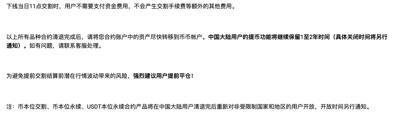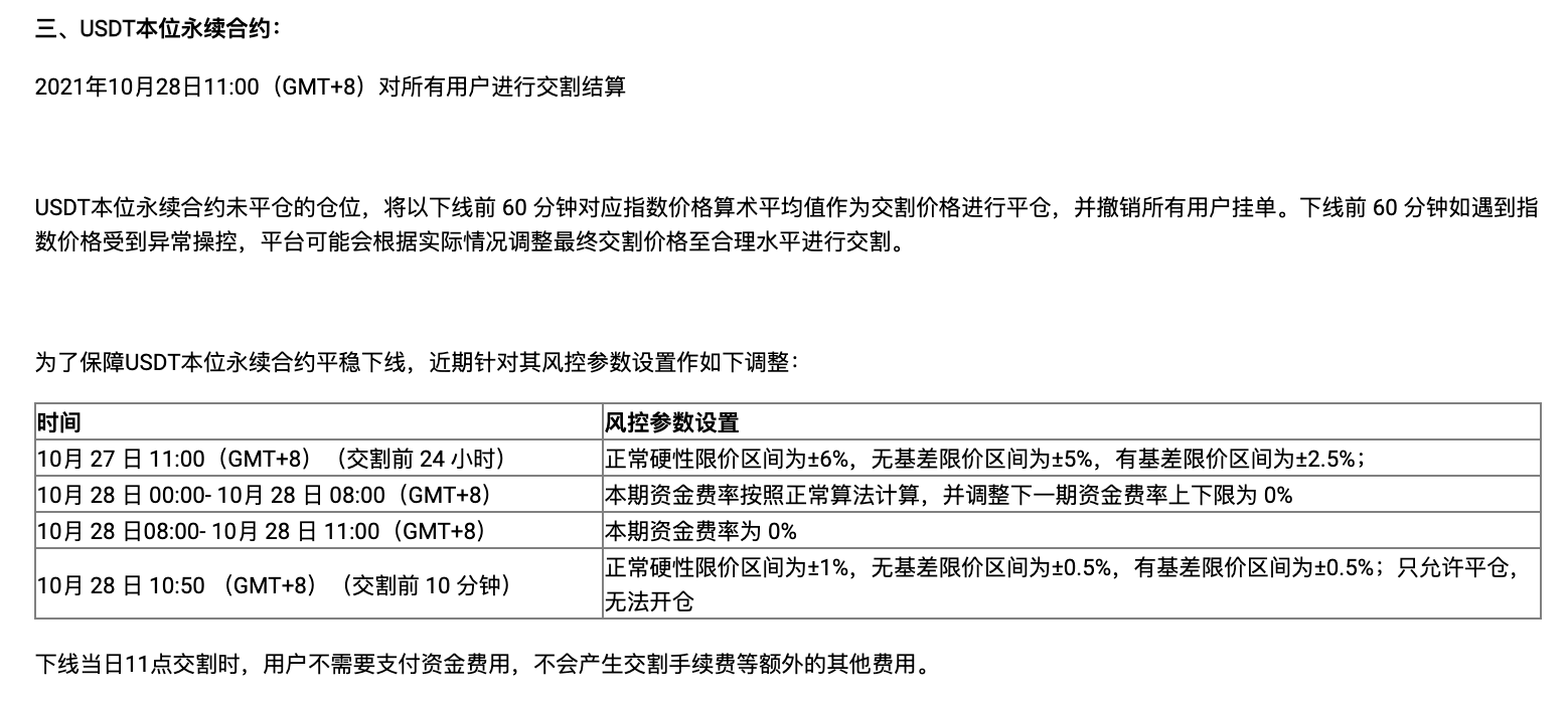 而作为“永不交割”的永续合约,现在也要强制交割了,而这分为币本位永续合约和USDT本位的永续合约。据官网资料介绍,永续合约未平仓的仓位,将以下线前 60 分钟对应指数价格算术平均值作为交割价格进行平仓,并撤销所有用户挂单。