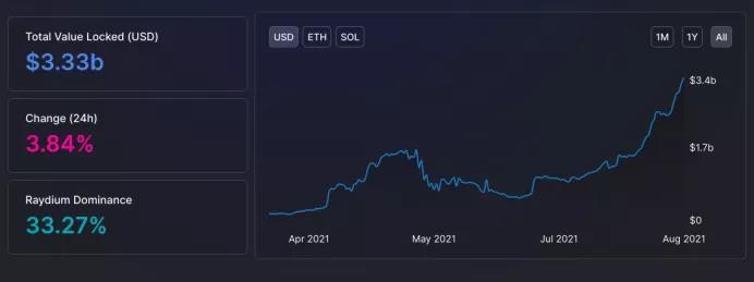 自今年5月起,Solana生态快速扩大,截至当前该链上已经建立起超过400个项目,囊括了DEX、衍生品、预言机、NFT、借贷、IDO平台等多个板块,根据DeFi Llama的数据,Solana链上TVL达到33.3亿美元,相比7月初的6.3亿美元增长了428.5%。
