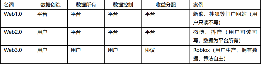 关于Web3.0,网络上有很多专业定义,笔者在此不做赘述,仅以最通俗易懂的方式来说明此概念。Web3.0是一个行业自创的概念,需结合Web1.0、Web2.0进行理解。下表为三者特征的对比: