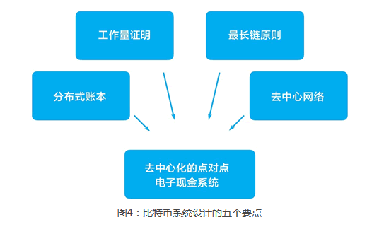 而从这个摘要中,我们提炼出了比特币系统设计的五个要点(见图 4):比特币的区块链系统是由分布式账本(即狭义的区块链)和去中心网络(点对点网络)组成的,形成链条的方式是工作量证明共识机制。最长链是由网络中的算力共同决定的,因而它是可信的,节点离开和加入依据的是最长链是可信的这一原则。这些组合起来形成了比特币系统。