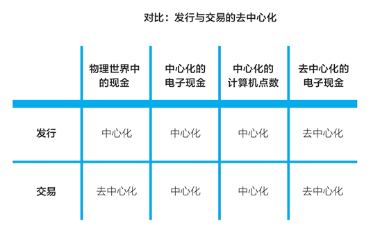 在这两个主流之外,一直还有着另外一种探索:能不能创造一种完全去中心化的点对点电子现金?其中最终极的设想是,在数字世界中,货币的发行和交易都不需要中心化机构介入,是由计算机自动执行的:在发行时,无须类似各国央行的中心化机构;两个人在相互转移电子现金时,也无须中心化机构的参与。按前面的对比表格,这种理想化的去中心化的电子现金几乎在每个方面都试图进行突破:不映射线下的货币,而在数字世界中自行发行;发行去中心化,不需要一个类似中央银行的角色;像物理世界中的现金交易一样,交易无须中介介入。这个问题很难,因为它的要求与数字世界中的技术基础设施的能力相悖。其中重要的一点是,在物理世界中,表示价值的现金纸币是不能复制的。但在数字世界中,数字化文档是可以复制的,每一个复制出来的文档都一模一样。因而过去在数字世界中,要用数字文件表示价值(比如表示一笔电子现金),我们需要一个中心化机构来确保数字文件是唯一的。假设这笔电子现金现在属于我,当我把它转给你时,我们需要一个中介来协助记录所有权的变更,我不能直接把数字文件复制给你。计算机密码学家们探索的是,在无须中心化介入的情况下,如何通过密码学的方法,用可复制的数字文件来代表价值。这是一个漫长的探索过程,其开端甚至比互联网商业化都还早,最早可追溯到 20 世纪 80 年代。总的来说,由于这种探索是基于加密技术的,因此各种去中心化数字现金也被称为加密数字货币(crypto-currency),其中 crypto 是密码学(cryptography)的词根。最终在 2008 年,匿名的中本聪在密码朋克的邮件列表中发布了比特币的设计。他发明的比特币系统几乎集合了第三类探索的所有智慧结晶,他又加入了新的创新,最终在电子现金的发行和交易上都实现了去中心化。正如我们所知,中本聪不只是设计和实现了这个最理想化的去中心化电子现金,他还“发明”了区块链技术。区块链的价值表示和价值转移功能让它可能成为新一代互联网的技术基础。