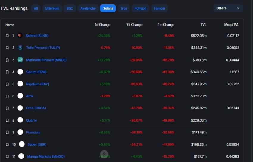 其他导致锁定总价值下降的 dApp 包括但不限于 Raydium、Atrix、Orca、Quarry、Francium、Sabre 和 Mango Markets。