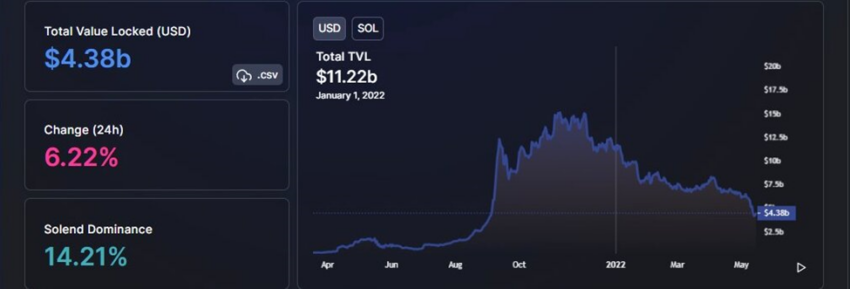 由于市场看跌趋势导致对去中心化金融( DeFi )的兴趣下降,Solana锁定总价值(TVL)在 5 月的第三周继续暴跌。