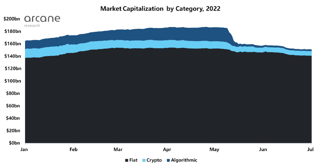 结果,在 2022 年 1 月至 2022 年 7 月期间,算法稳定的市场主导地位从 8% 下降到 2%。这为法定支持的稳定市场份额增加 11.9% 扫清了道路——由 USDC 和 BUSD 增长 21.9%市值。因此,到目前为止,算法稳定币在 2022 年没有出现增长,至少从市值来看是这样。